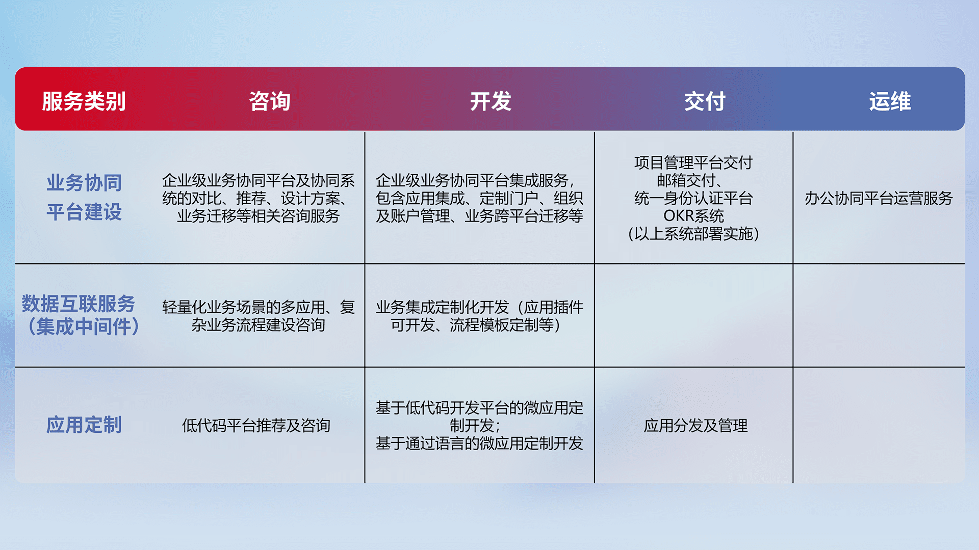 针对钉钉、、、、企微、、IDaas等平台级产品提供产品的规划、、、方案、、、、交付、、、定制化开发等服务,,实现如统一协同办公、、、、智能客户服务、、、、混合会议管理、、、智能数据查询、、、等业务场景,,实现数字化转型。。。